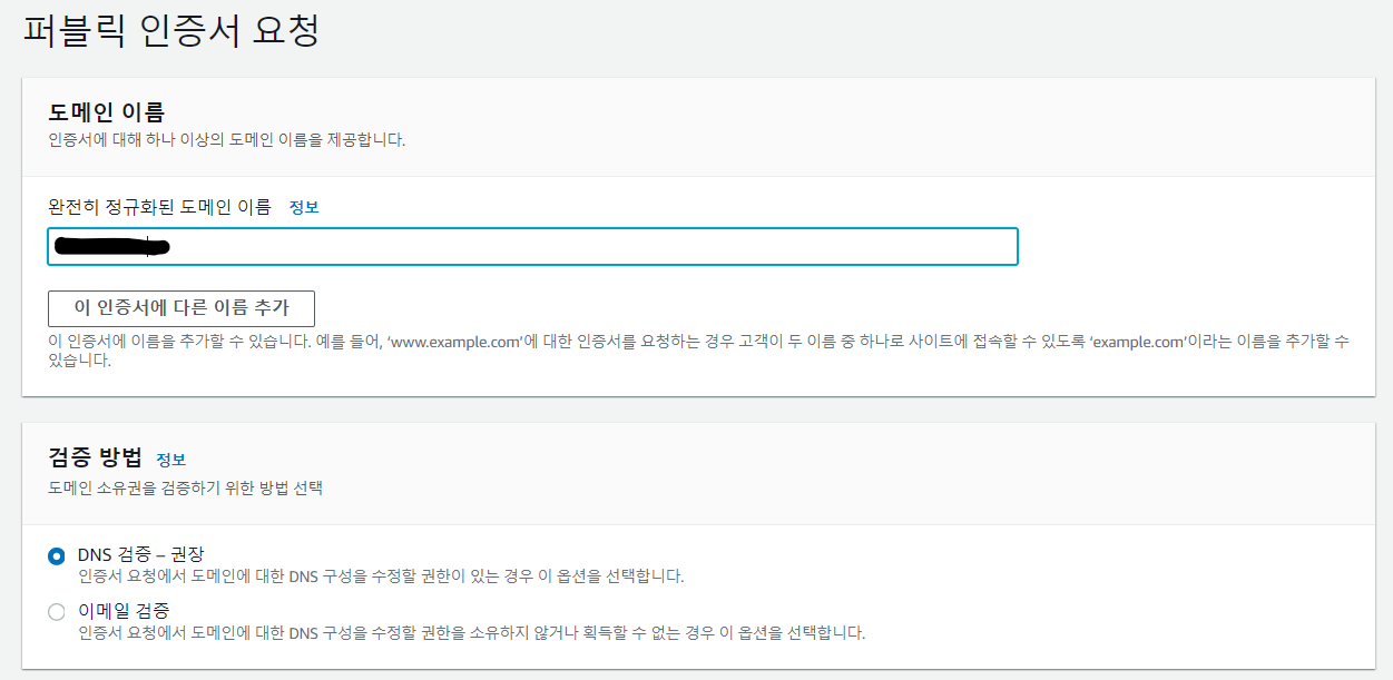도메인 이름 작성과 검증방법 DNS 검증-권장 선택 후 요청