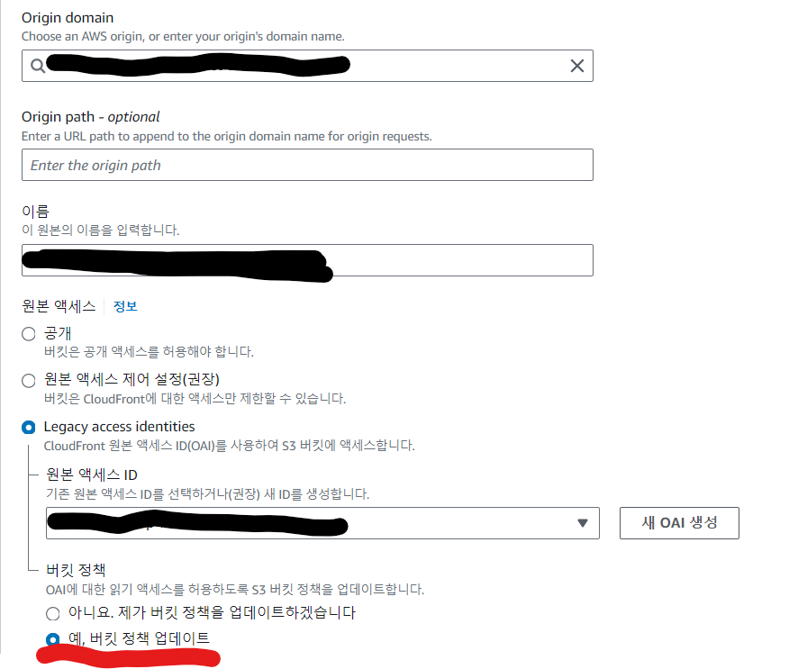 새 OAI 생성을 눌러 원본 엑세스 ID를 발급 & 버킷 정책 예 선택
