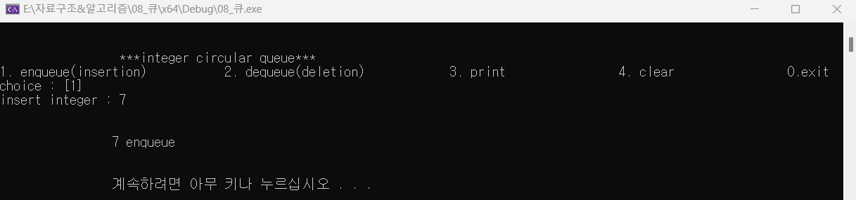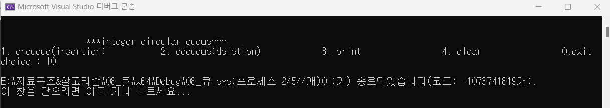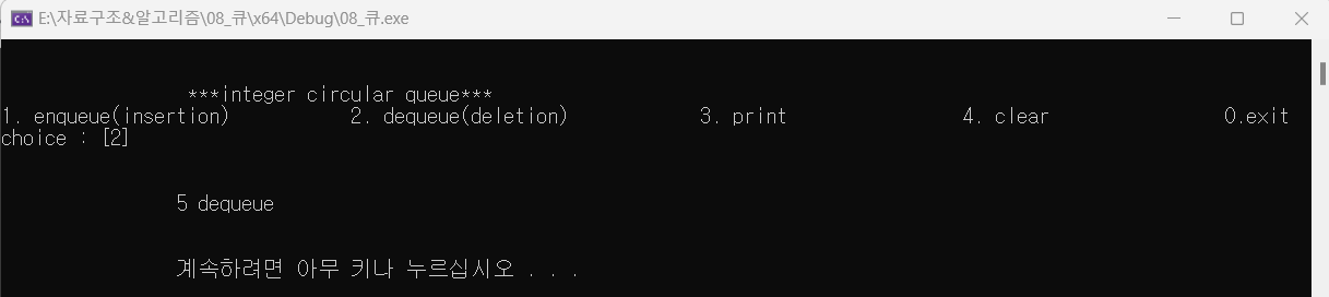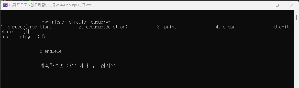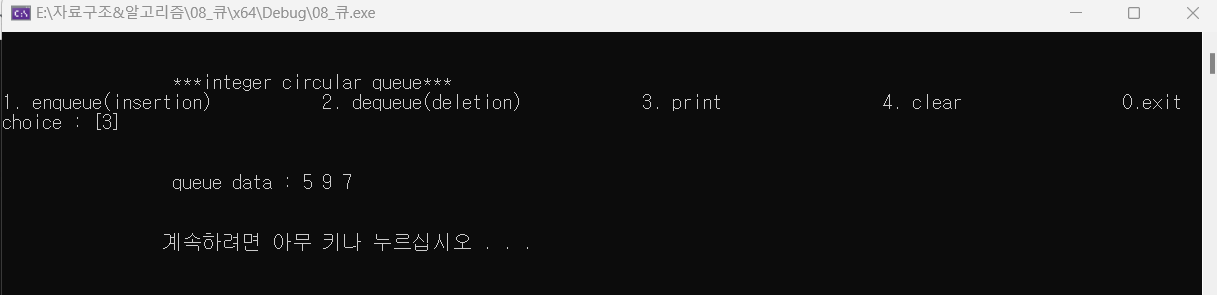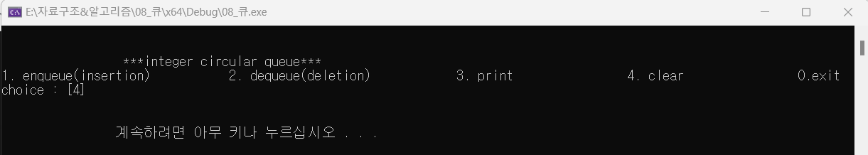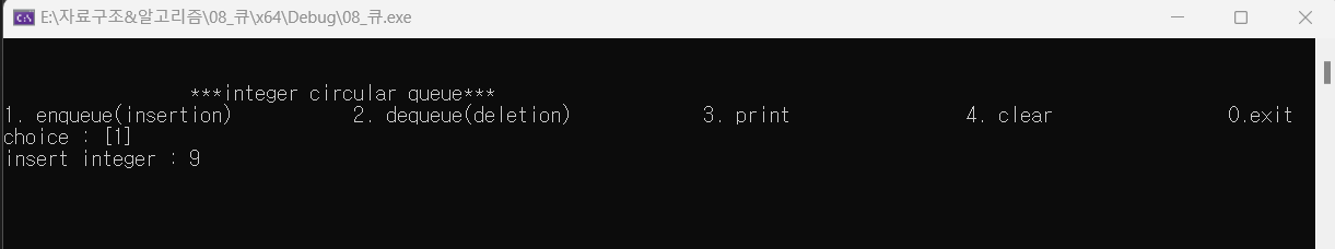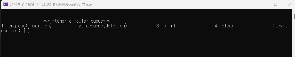 printf("1. enqueue(insertion) 2. dequeue(deletion) 3. print 4. clear 0.exit\n");