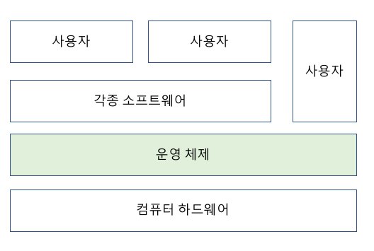 컴퓨터 하드웨어 바로 위에 설치되어 사용자 및 다른 모든 소프트웨어와 하드웨어를 연결하는 소프트웨어 계층
