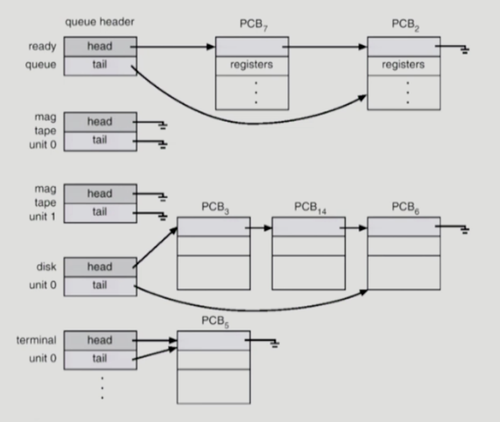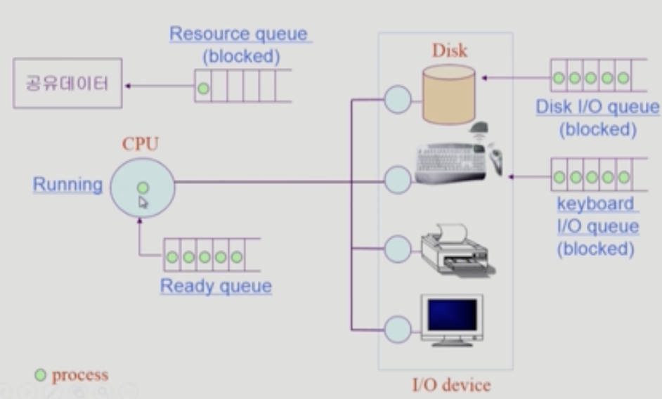 - Device queues: I/O device의 처리를 기다리는 프로세스의 집합