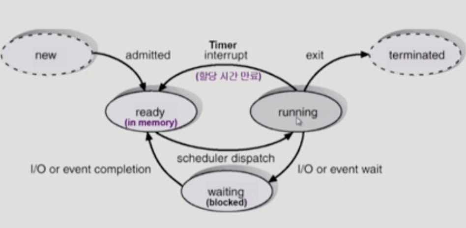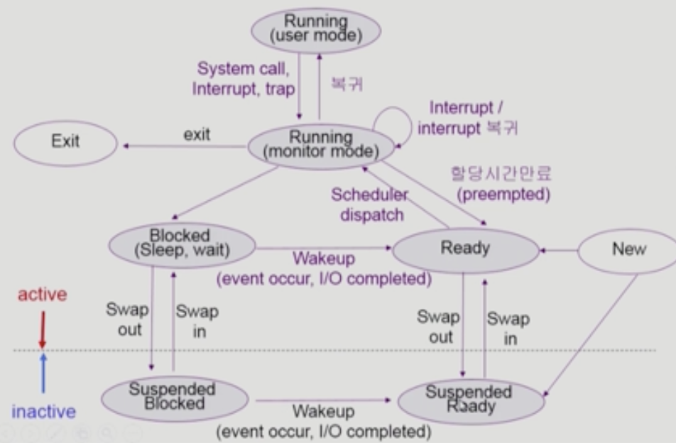 - Running: CPU를 잡고 instruction을 수행중인 상태