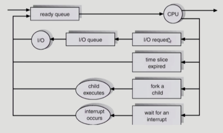 - Ready queue: 현재 메모리 내에 있으면서 CPU를 잡아서 실행되기를 기다리는 프로세스의 집합