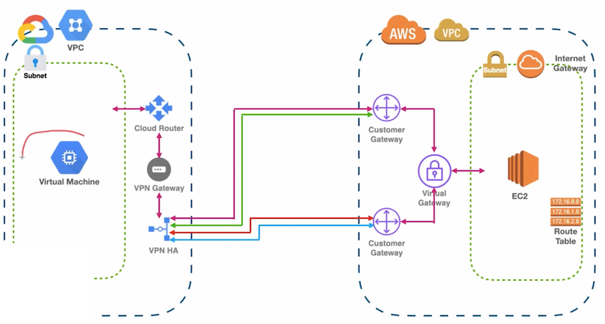 가상 프라이빗 게이트웨이 (Virtual Private Gateway): AWS VPC 측에 붙는 VPN 종단점입니다. (여러 VPC 연결 시 Transit Gateway를 사용하기도 함)