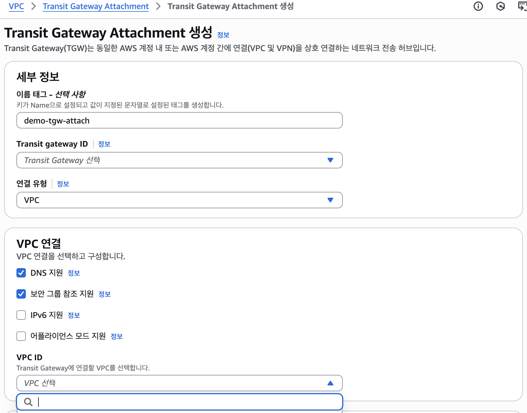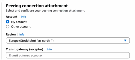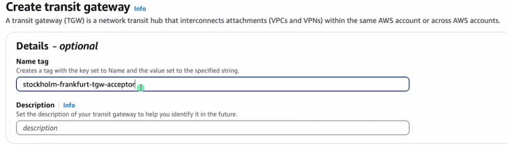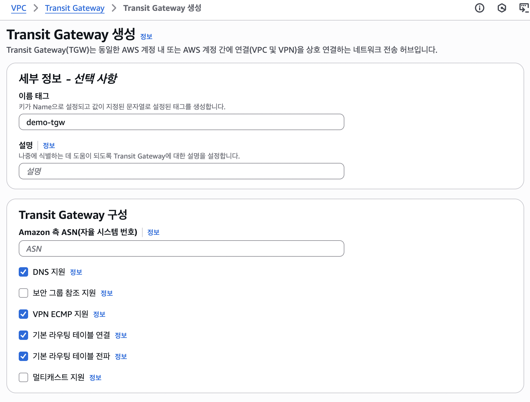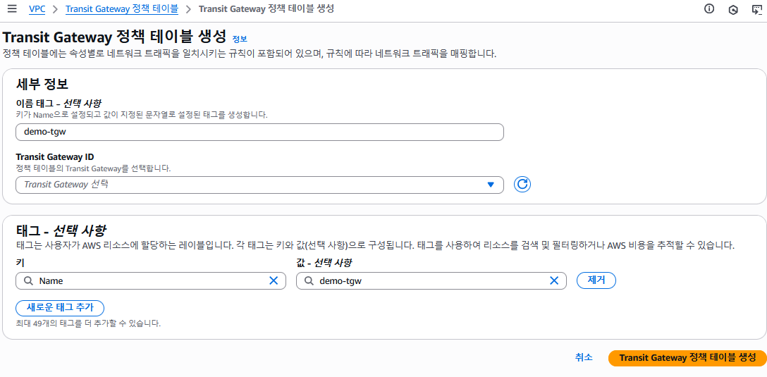 피어링 경우 피어링 연결 쪽에 accepter tgw 를 따로 생성해서 연결해줘야됨