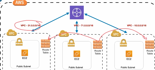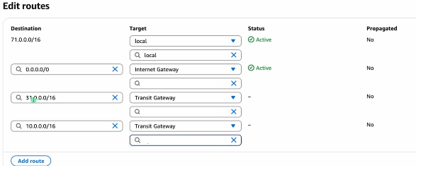 위와 동일하게 71.0.0.0/16 , 31.0.0.0/16 ,10.0.0.0/16 각각을 트랜짓게이트웨이에 연결