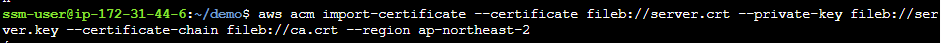 $ aws acm import-certificate --certificate fileb://server.domain.tld.crt --private-key fileb://server.domain.tld.key --certificate-chain fileb://ca.crt --region ap-northeast-2