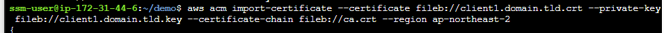 $ aws acm import-certificate --certificate fileb://client1.domain.tld.crt --private-key fileb://client1.domain.tld.key --certificate-chain