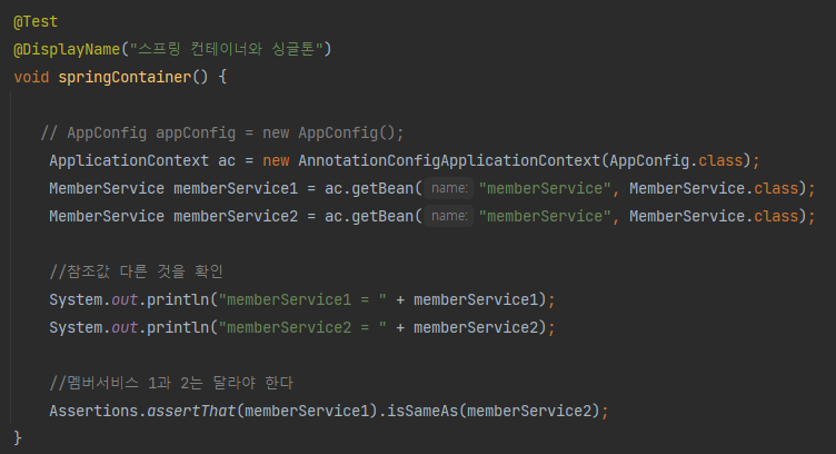 스프링 컨테이너는 싱글톤 컨테이너 역할을 한다. 이렇게 싱글톤 객체를 생성하고 관리하는 기능을 싱글톤 레지스트리라 한다.