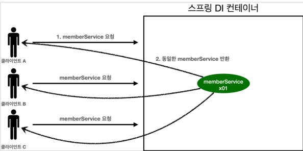 스프링 컨테이너 덕분에 고객의 요청이 올 때 마다 객체를 생성하는 것이 아니라, 이미 만들어진 객체를
