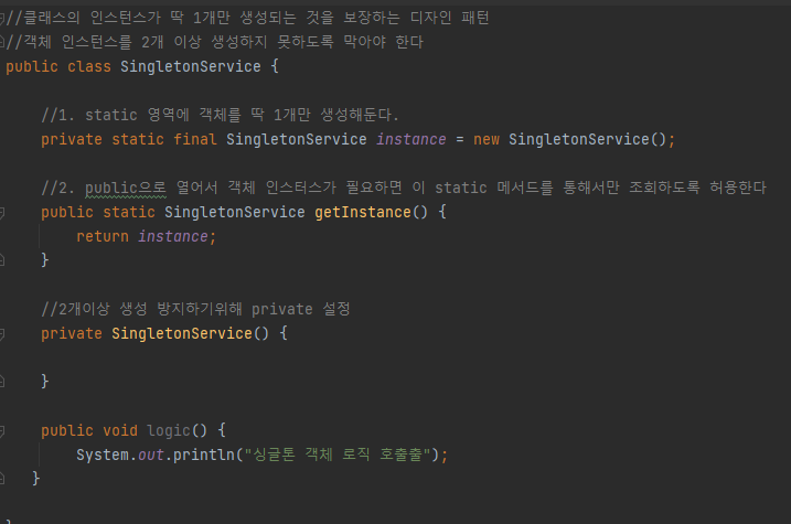 싱글톤 패턴을 구현하는 코드 자체가 많이 들어간다.