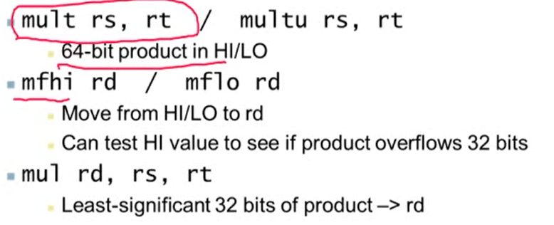 - MIPS의 곱하기 연산 결과는 64bit으로 저장되므로 32bit 레지스터 2개가 필요