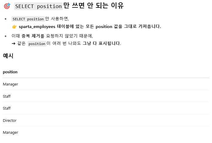 어려웠던 점: 'sparta_employees 테이블에서 중복 없이 모든 직급(position)을 선택하는 쿼리를 작성해주세요'에서, '중복 없이' 라는 표현에 사용되는 DISTINCT 라는 필터링 조건을 강의에서는 듣지 못해 코드 작성에 어려움을 겪었다.