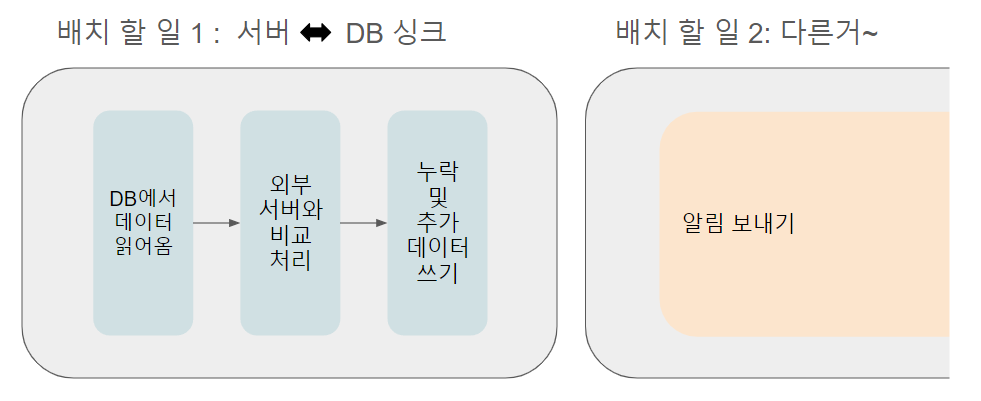 이렇게 간단하게 나타내면 배치 할 일의 경우 DB에서 데이터를 읽어와 외부서버와 비교하여 처리하고있고 또다른 배치 할 일의 경우 알림을 보낸다.