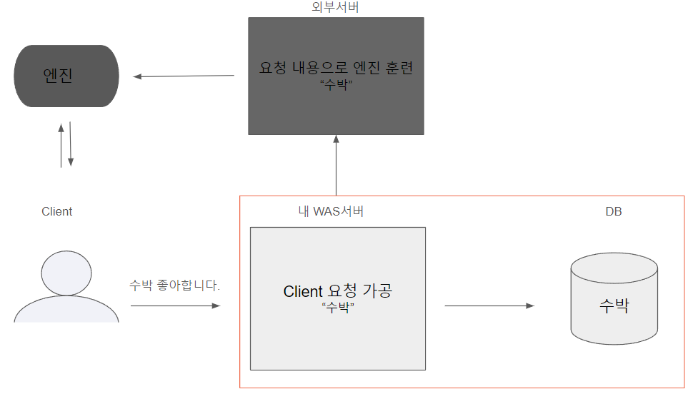 나는 주황 박스안을 구현했다. 들어온 CLIENT요청을 가공해서 (1) DB와 (2) 외부서버에 같은 내용을 뿌려야한다.