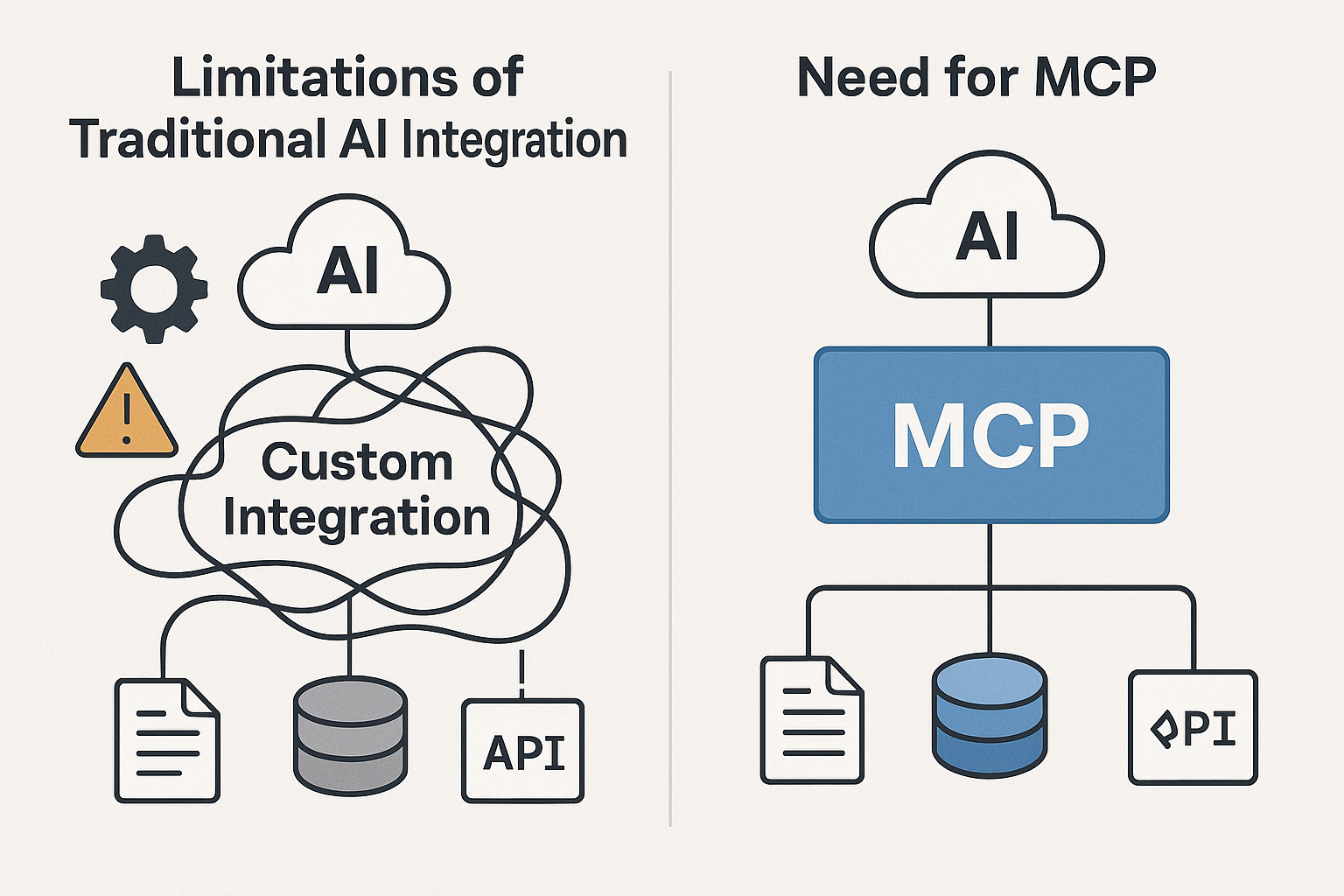 기존 방식은 AI가 실시간 외부 데이터에 접근하거나, 여러 시스템 간 컨텍스트(상황 정보)를 유지하며 작업하는 데 한계가 있습니다.