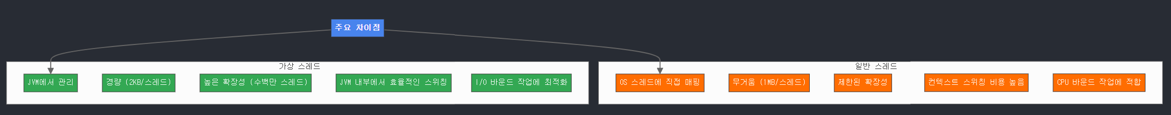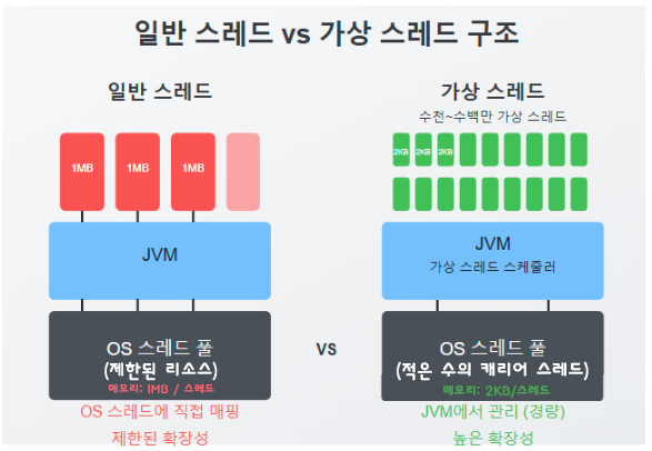 일반 스레드는 OS 스레드에 직접 매핑되어 OS의 한계에 직면하지만, 가상 스레드는 이런 제약이 없습니다.