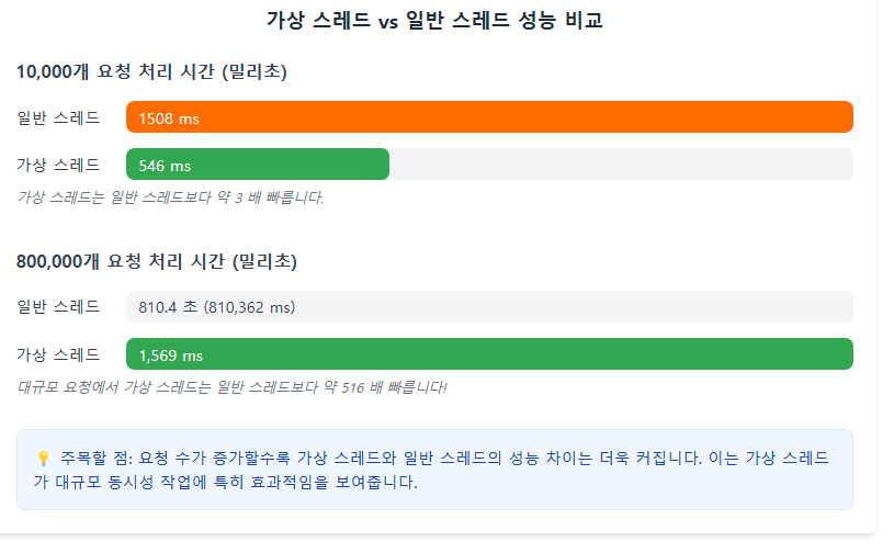 이 결과는 가상 스레드가 대규모 동시 요청을 처리하는 서비스에 얼마나 혁신적인 영향을 미칠 수 있는지 보여줍니다.