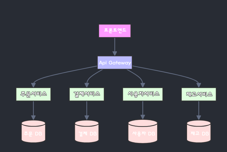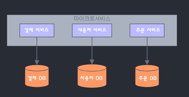 결제 서비스는 결제 DB, 사용자 서비스는 사용자 DB를 사용합니다.