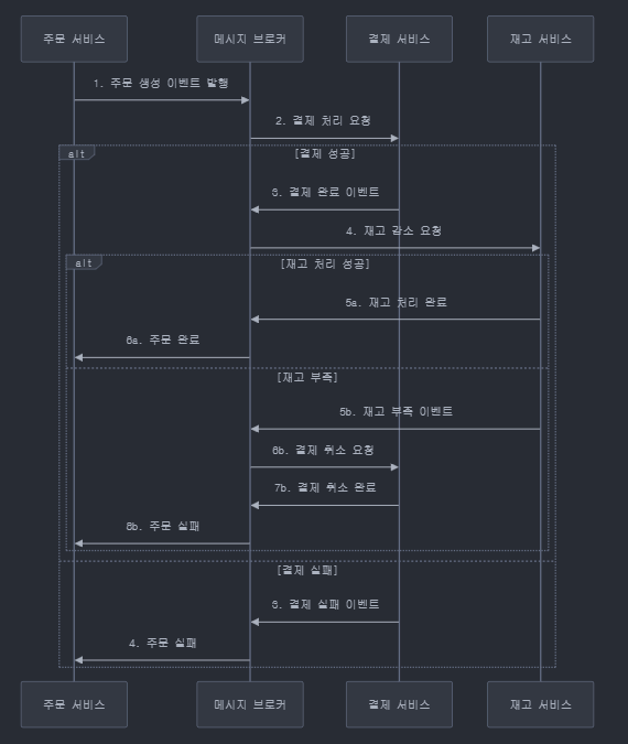 트랜잭션을 여러 단계의 로컬 트랜잭션으로 나누고, 각 단계가 성공하면 다음 단계로 넘어갑니다.