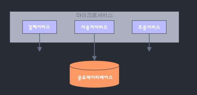 예를 들어, 결제 서비스와 사용자 서비스가 같은 데이터베이스를 사용하는 구조입니다.
