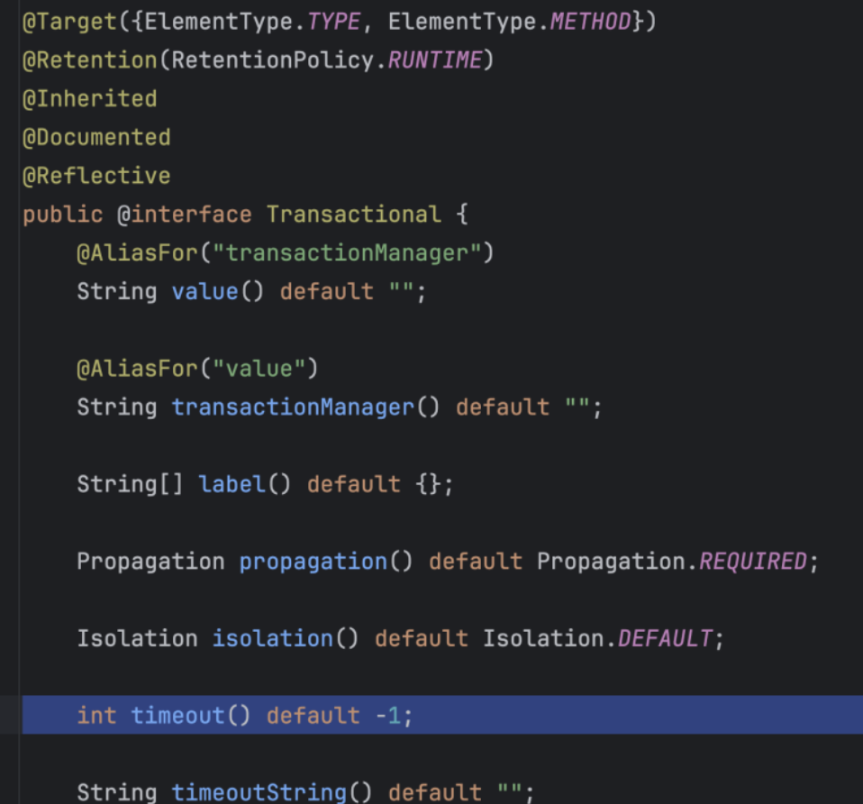 Transactional 어노테이션은 위에 이미지처럼 timeout 기본 값은 -1이고, 설정하지 않았다면 무한정 트랜잭션이 길어질 수 있음을 의미합니다.