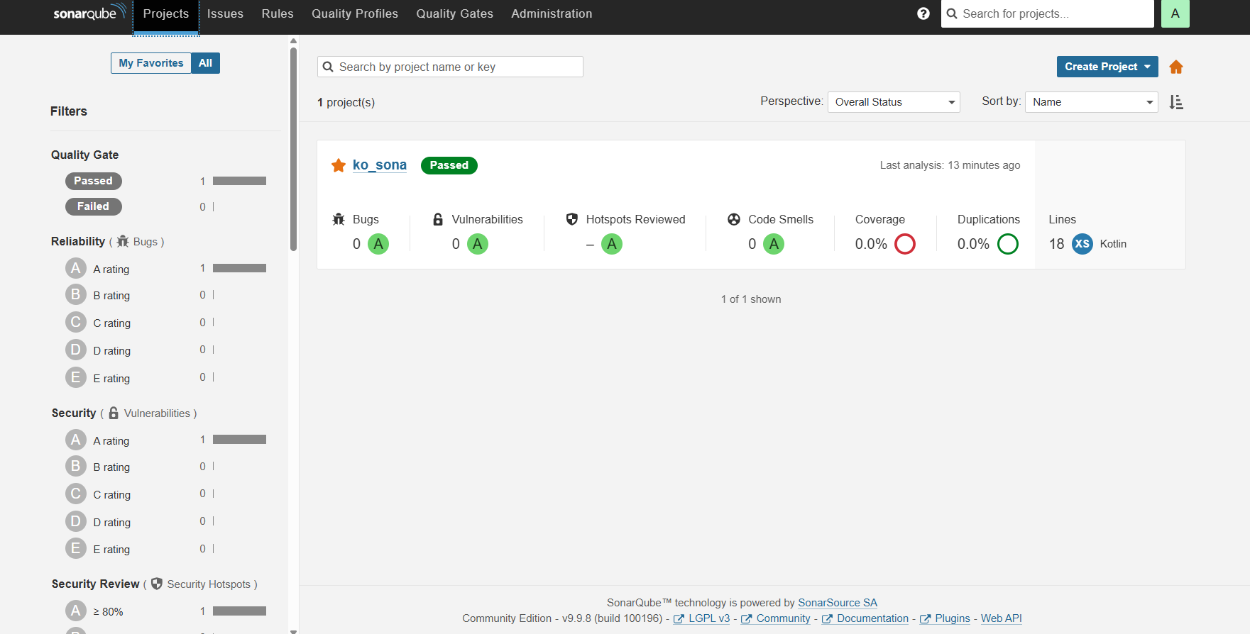 로그인 후 SonarQube 대시보드에 접속하면 다음과 같은 정보를 확인할 수 있습니다.