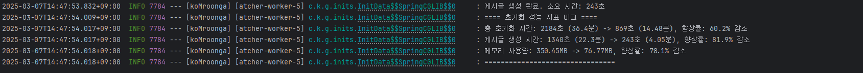 | 게시글 생성 시간 | 1340초 (22.3분) | 243초 (4.05분) | 약 81.9% 감소 |