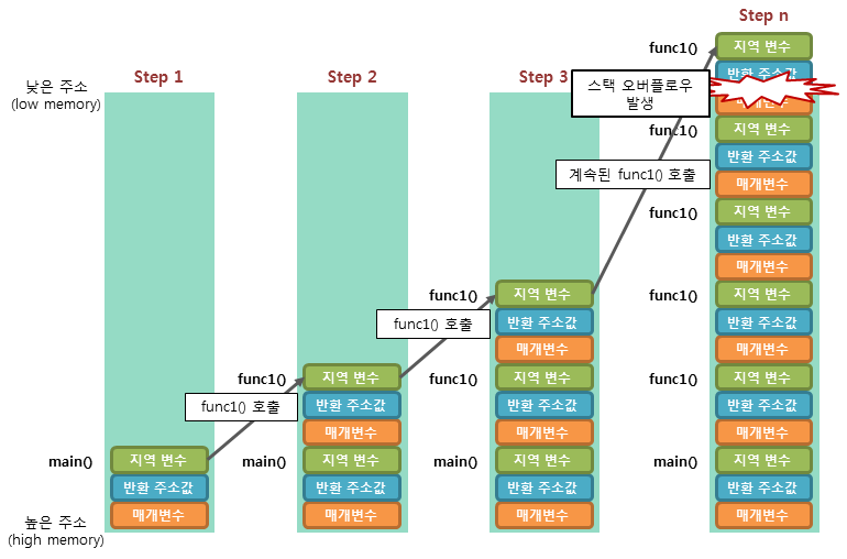 위에 설명에 과정중 재귀 호출이 무한히 반복되면 스택프래임이 계속 쌓여 갈 것이고 스택 영역의 공간을 다 차지하고 난 후 더 이상 여유 공간이 없을때 또 다시 스택 프레임을 저장하게 되면, 해당 데이터는 스택 영역을 넘어가서 저장되게 됩니다.