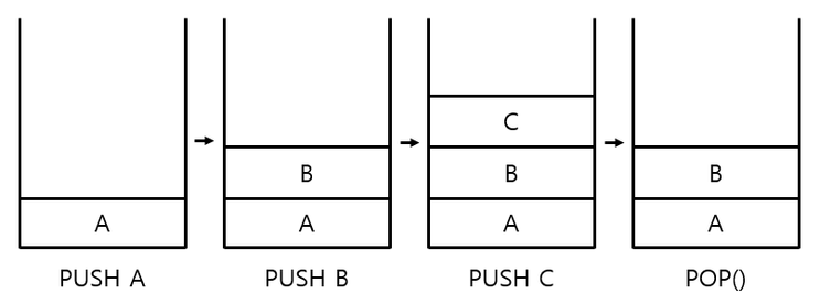 스택은 후입선출(LIFO, Last-In First-Out) 방식에 따라 동작하므로, 가장 늦게 저장된 데이터가 가장 먼저 인출됩니다.
