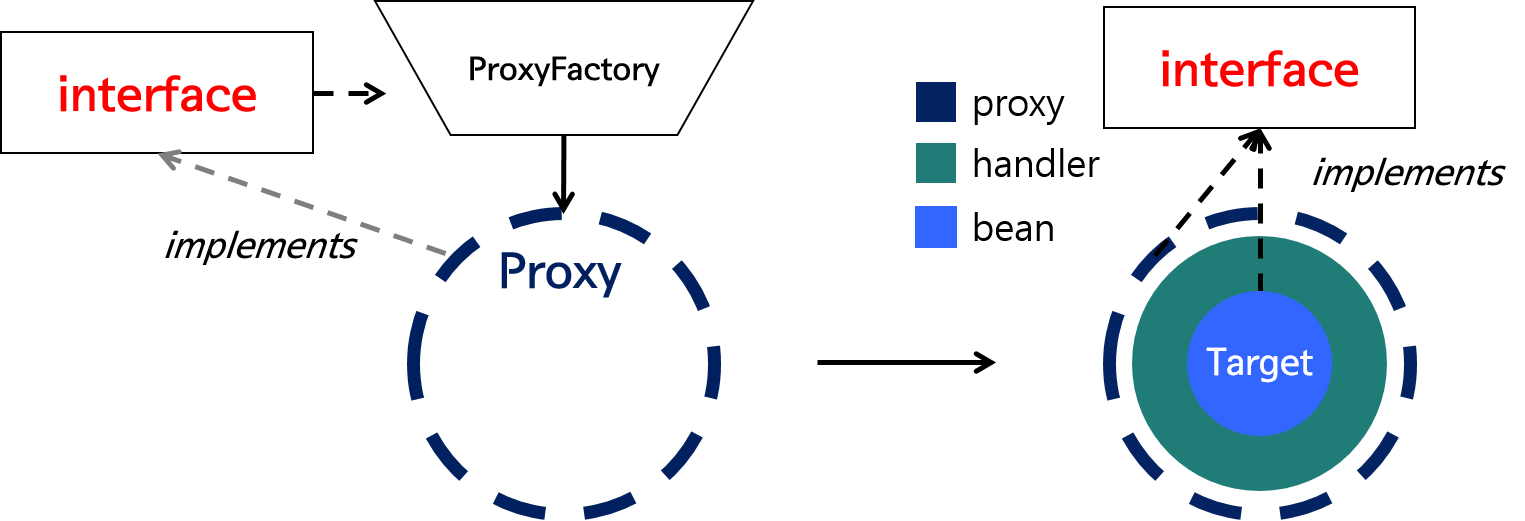 ProxyFactory에 의해 타겟의 인터페이스를 상속한 Proxy 객체를 생성한다.Proxy 객체에 InvocationHandler를 포함시켜서 하나의 객체로 반환한다.다음과 같이 Proxy를 생성하는 과정에서 핵심적인 부분은 인터페이스를 기준으로 Proxy객체를 생성한다는 것이다. 따라서 구현체는 인터페이스를 상속해야 하고, @Autowired을 통해 생성된 Proxy Bean을 사용하기 위해서는 반드시 인터페이스의 타입으로 지정해야 한다. 이런 Proxy의 구조를 이해하지 못하면 다음과 같은 실수를 저지를 수 있다. (만약 JDK Dynamic Proxy만 사용한다고 가정했을 때)