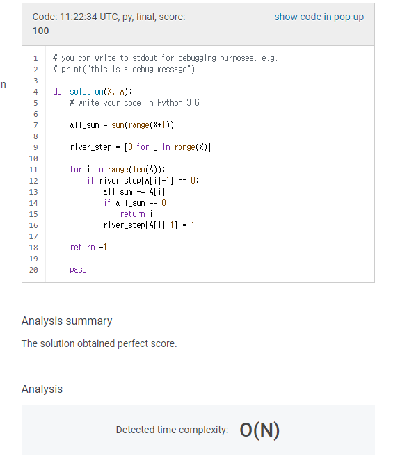 def solution(X, A): # write your code in Python 3.6 all_sum = sum(range(X+1)) # 1~X의 합 river_step = [0 for _ in range(X)] for i in range(len(A)): if river_step[A[i]-1] == 0: all_sum -= A[i] if all_sum == 0: return i river_step[A[i]-1] = 1 return -1 pass