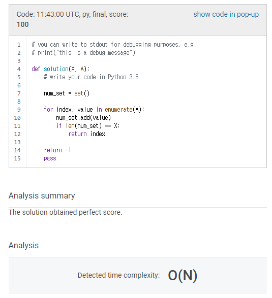 내가 생각한 방법은 1~X의 합을 구한 뒤, 각 숫자가 최초로 나올 시에만 A의 원소만큼 빼주어 합이 0이 되면 원소가 모두 나왔다고 가정하고 해당 인덱스를 반환하는 방식으로 풀었다.