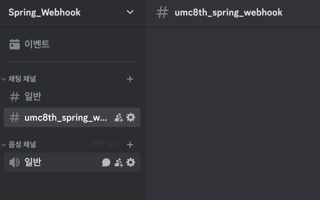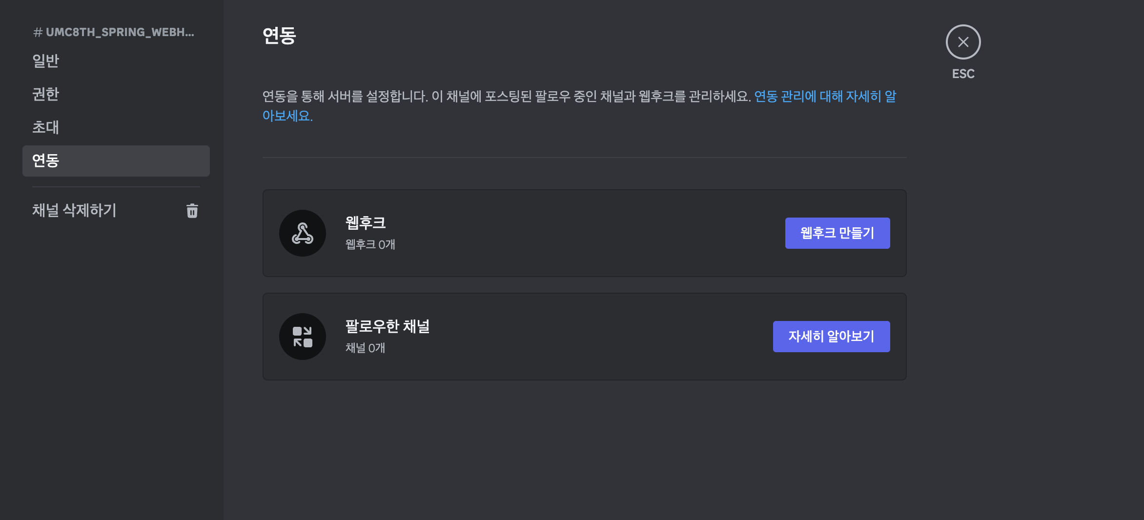 채널 설정에 들어가 웹후크 항목에 들어간 뒤,