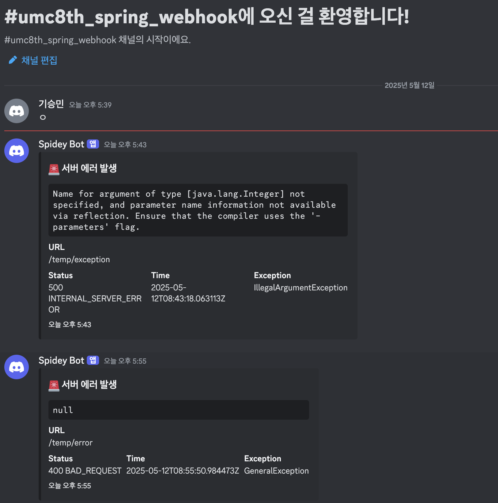 이후, 다음과 같이 예외를 처리하는 메서드에 sendToDiscord() 메서드를 통해 메시지를 디스코드에 전달하도록 코드를 추가해주었다.