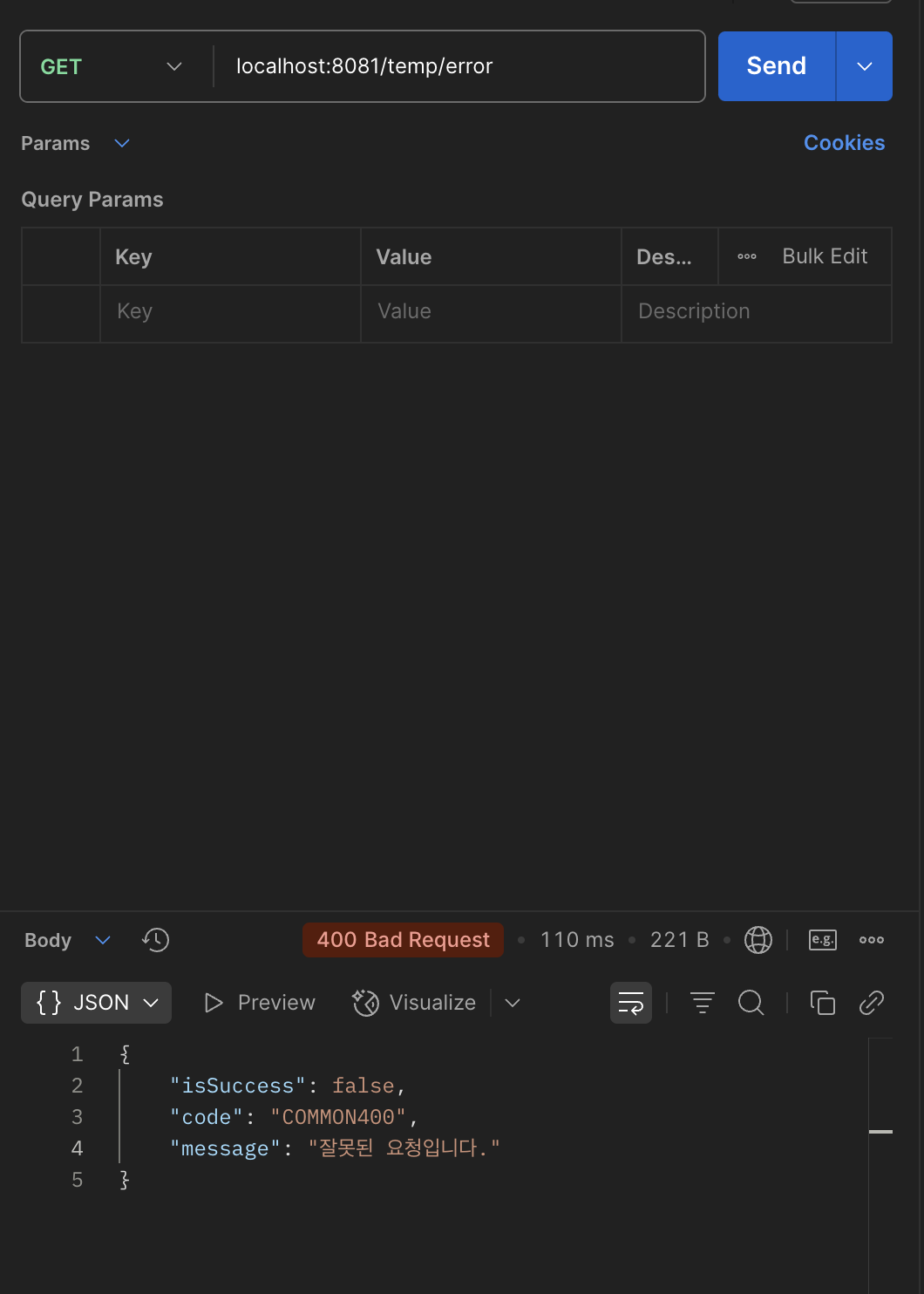 실제로 예외에 대해 메시지가 적절하게 발생하는지 확인하기 위해 기존에 작성되어 있던 TempRestController에 에러 전용 api 엔드포인트를 추가해주었다.