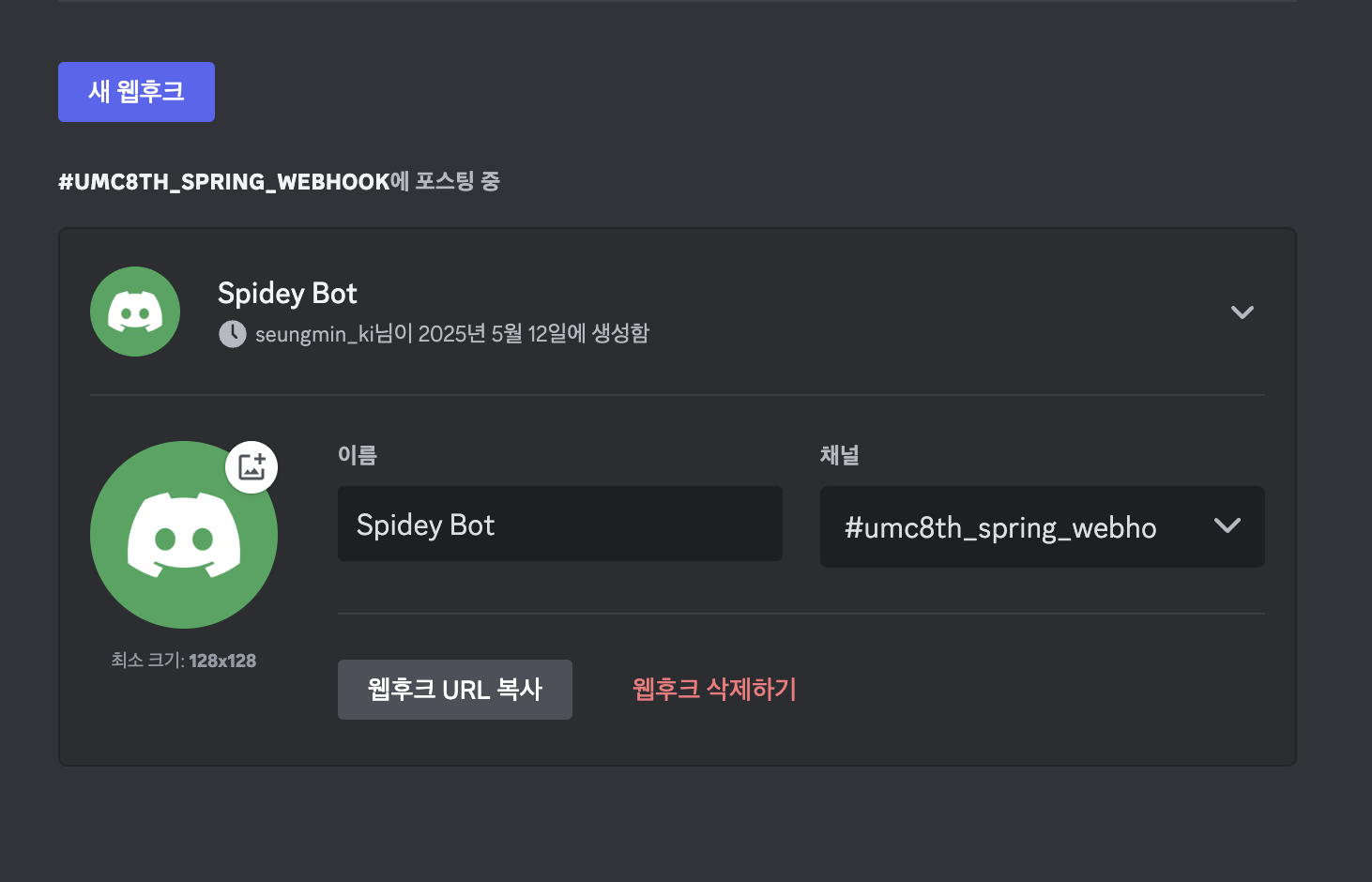 다음과 같이 새로운 웹 후크를 생성해주었고, '웹후크 URL 복사' 버튼을 눌러 URL을 복사해주었다.