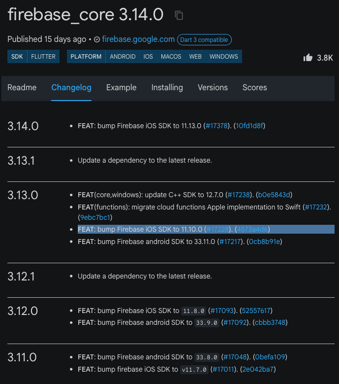 pub_dev 에서 패키지마다 하나씩 검색해서 확인해야 하는건가 싶었는데, 다행히 firebase_core 만 체크해보면 되었다.