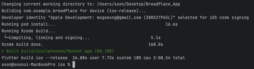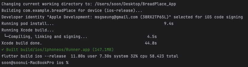 time flutter build ios —release 명령어로 실행했을 때