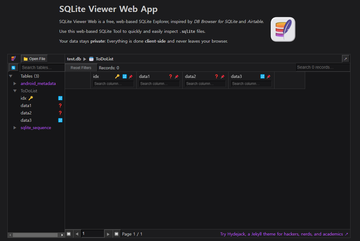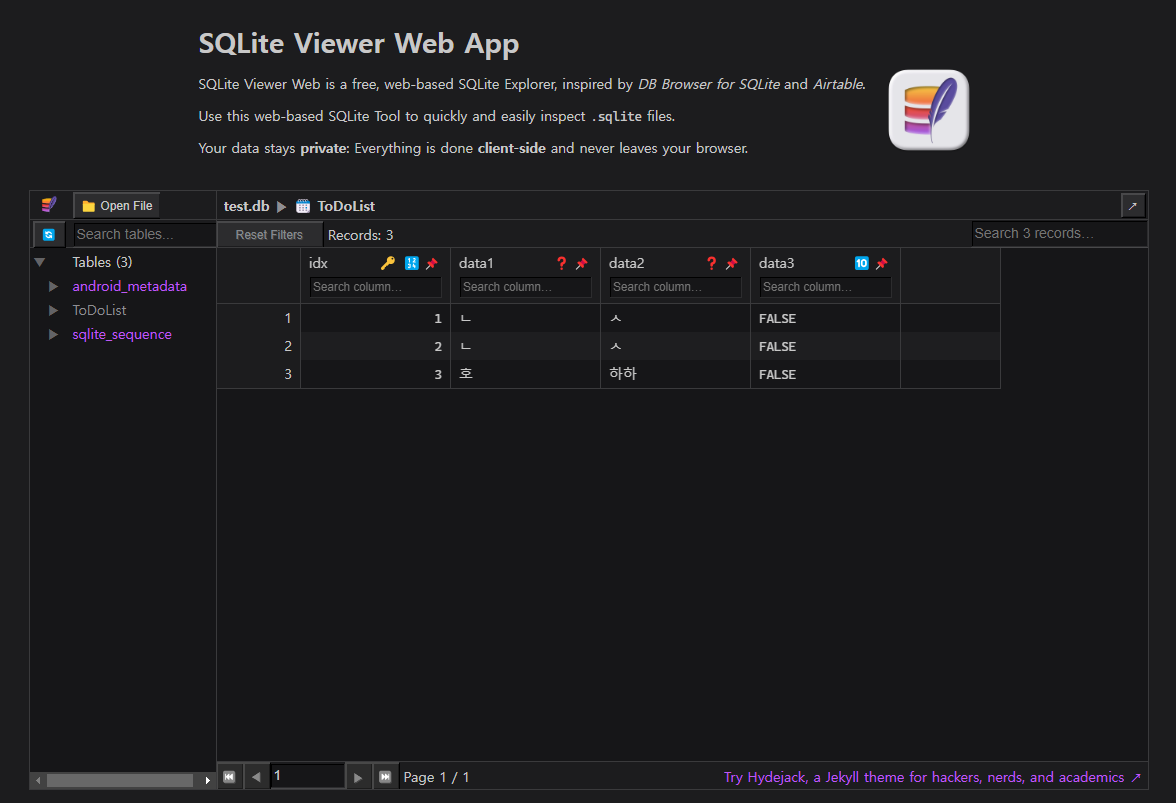 (3) 생성된 DB의 모습 캡처 (sqliteviewer 사이트)