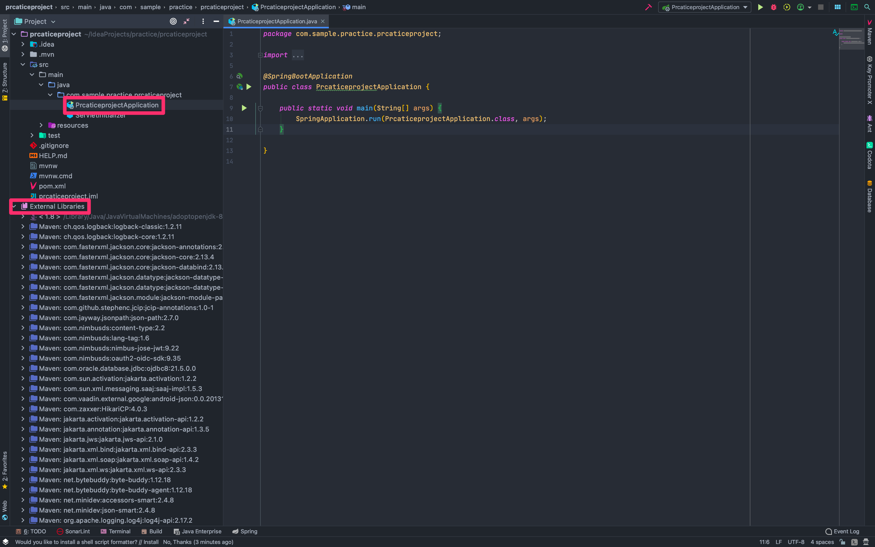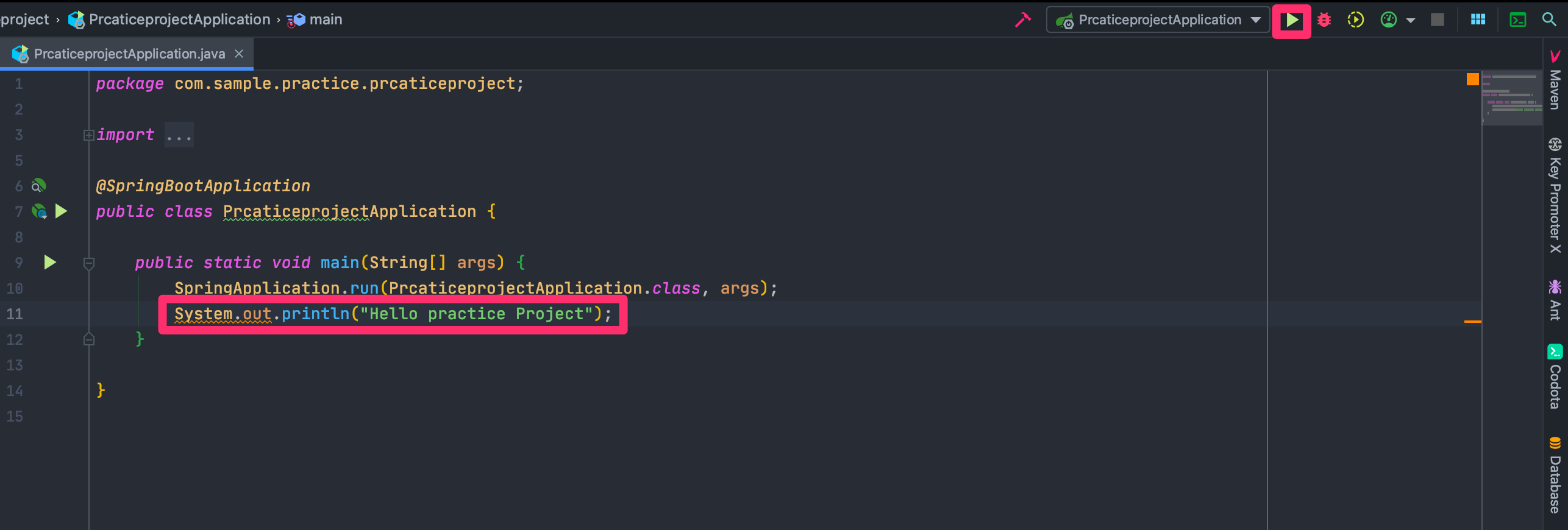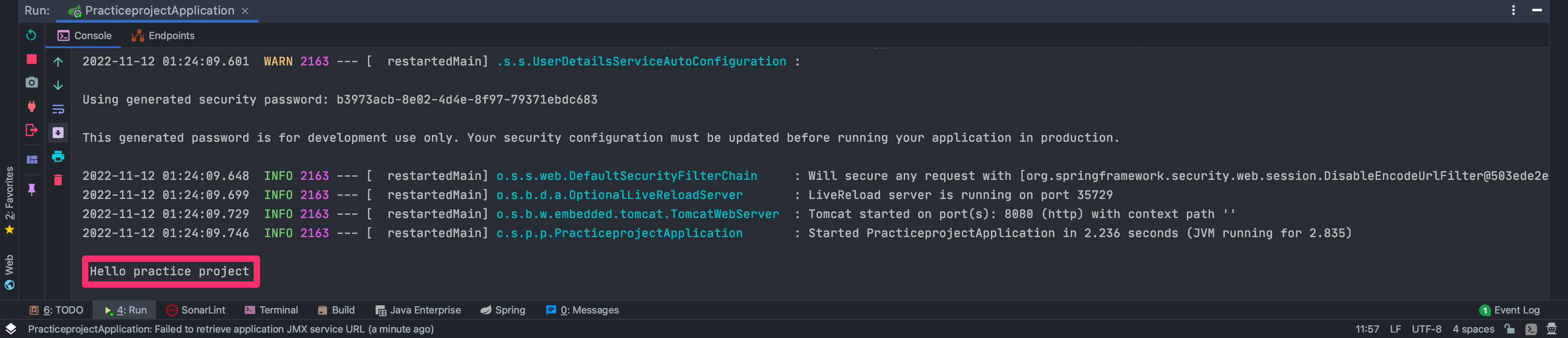 8. 하단 Console 란에 Hello practice project 가 정상적으로 출력된것이 확인되면 완료.