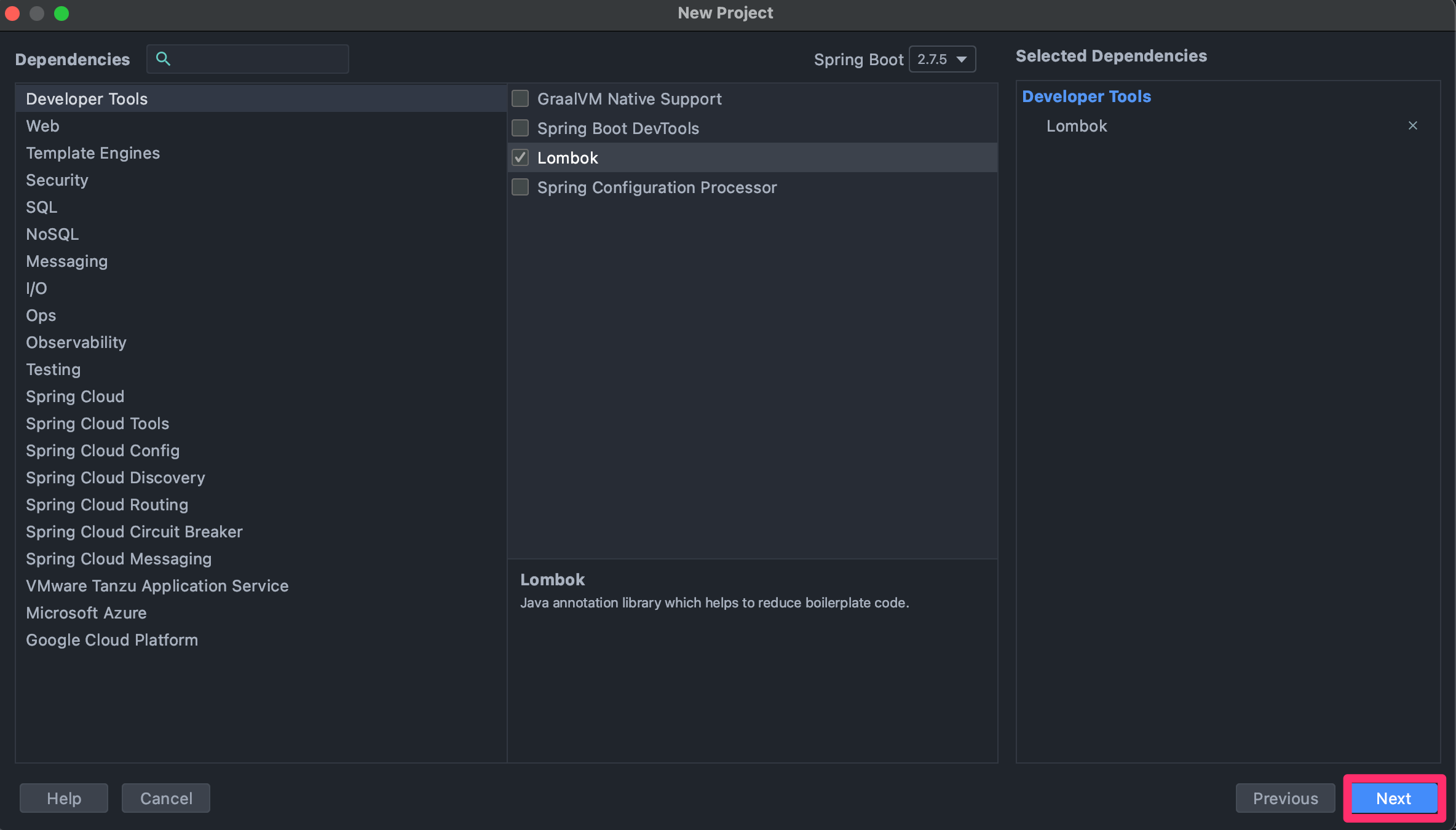 4. 프로젝트에 필요한 외부 라이브러리 Dependencies 를 추가하고 Next 버튼을 클릭합니다.