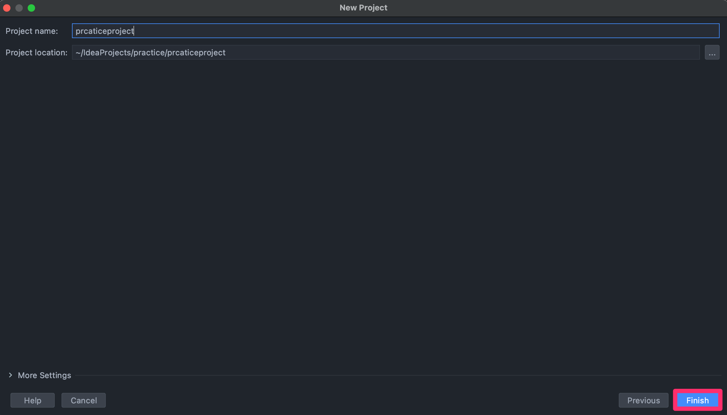 5. Project name 을 입력하고 Finish 버튼을 눌러줍니다.