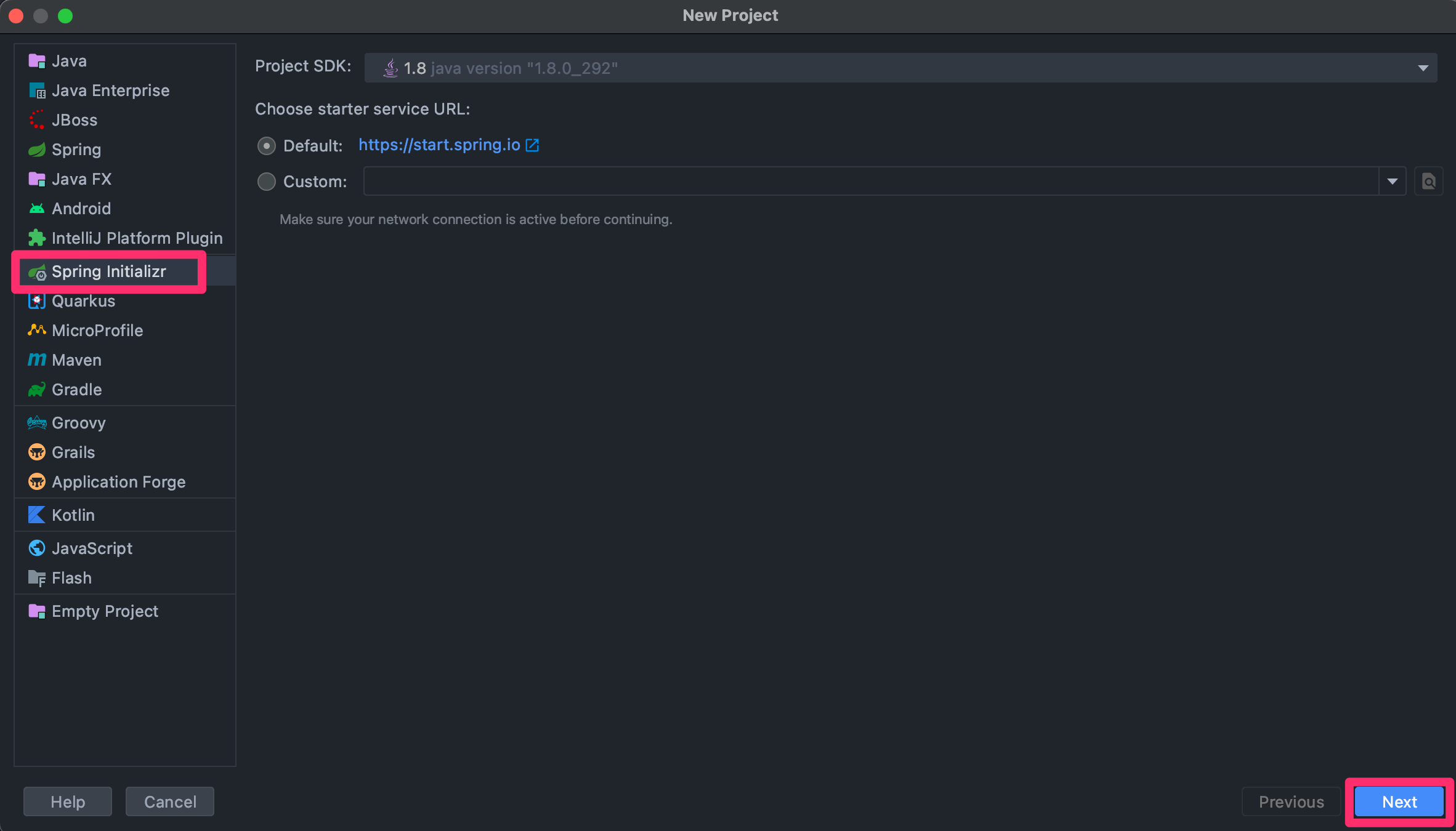 2. Spring initializr를 클릭한 뒤 프로젝트에서 사용할 SDK를 선택하고 Next 버튼을 클릭합니다.