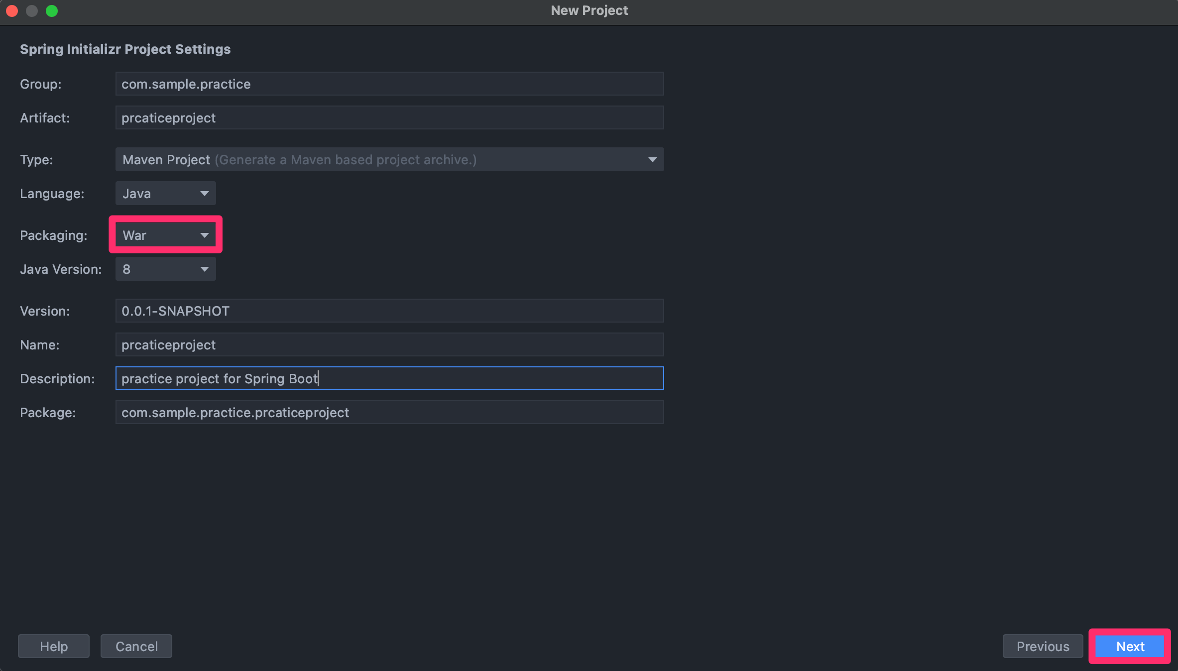 3. Group, Atrifact 등을 작성한 뒤 Pakaging을 War로 선택합니다.