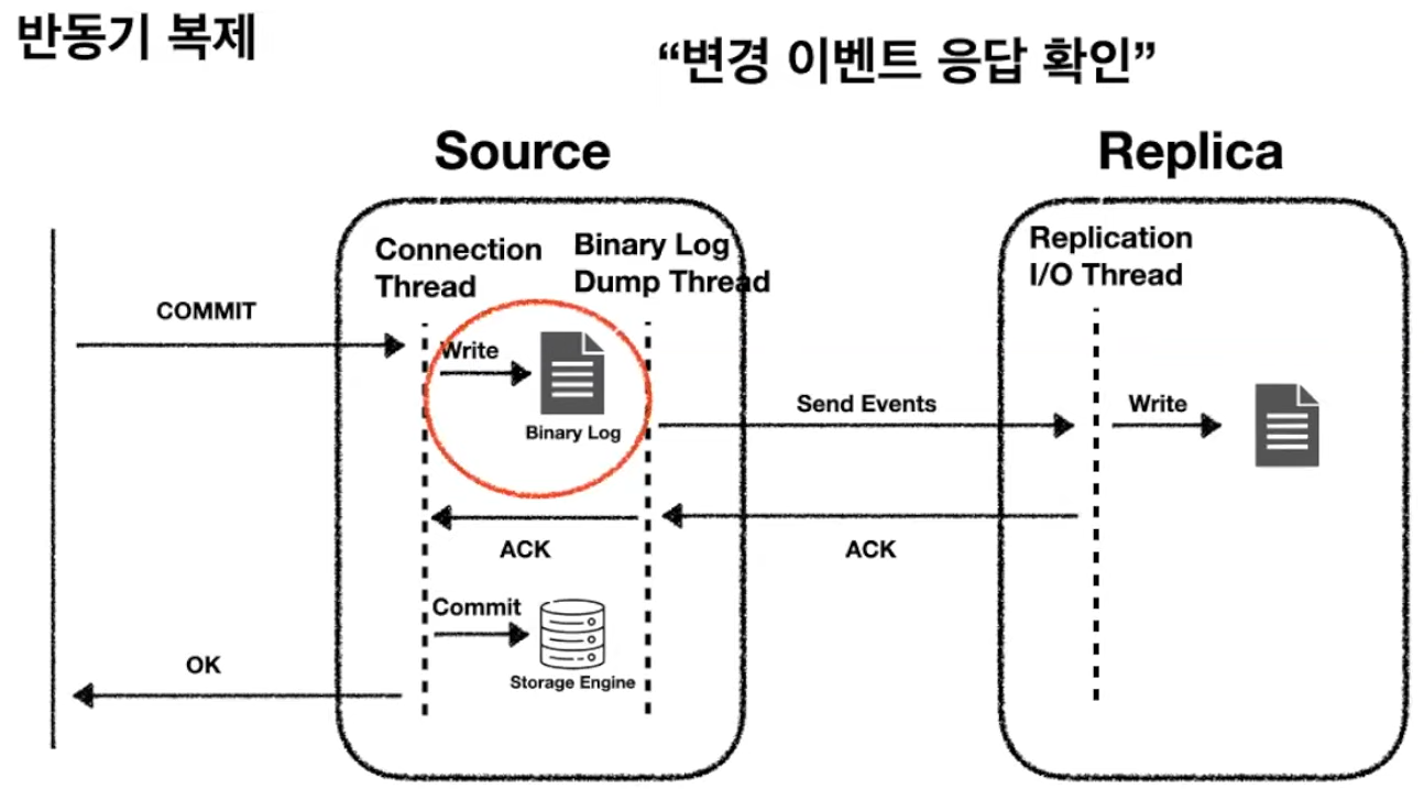 반동기 복제에서 소스 서버는 리플리카 서버가 소스 서버로부터 전달받은 변경 이벤트를 릴레이 로그에 기록 후 응답(ACK)을 보내면 그때 트랜잭션을 완전히 커밋시키고 클라이언트에 결과를 반환한다.