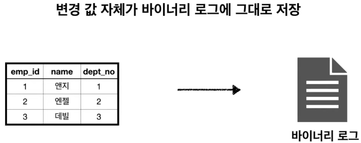 Row 기반 바이너리 로그 포맷 방식은 MySQL 서버에서 데이터 변경이 발생했을 때 변경된 값 자체가 바이너리 로그에 기록되는 방식이다.