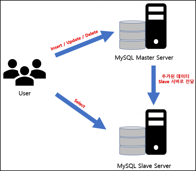 어플리케이션은 데이터베이스에 SQL 명령을 보내 데이터를 삽입/변경/삭제하게 되는데, 마스터 서버는 SQL 명령을 수신하면 그 SQL 명령을 리플리카 서버에도 똑같이 보낸다. 이렇게 되면 마스터 서버와 리플리카 서버의 데이터가 동일한 상태로 유지된다.