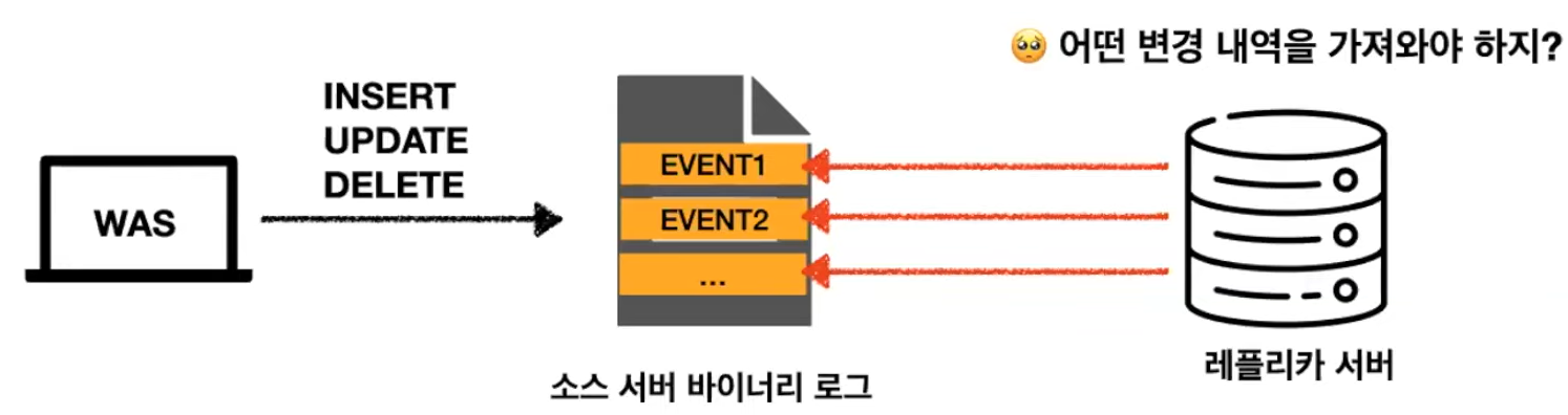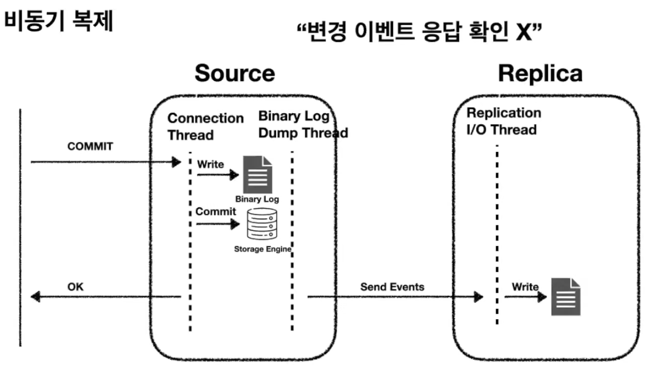 비동기 복제는 MySQL의 기본적 동작 방식으로 소스 서버가 자신과 복제 연결된 리플리카 서버에서 변경 이벤트가 정상적으로 전달되어 적용되었는지를 확인하지 않는 방식이다.