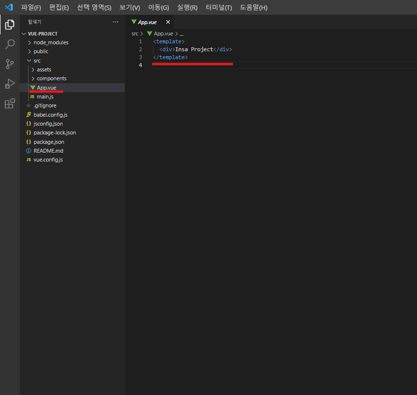 src 폴더 안에 App.vue 라는 파일을 아래 이미지와 같이 수정한 뒤,